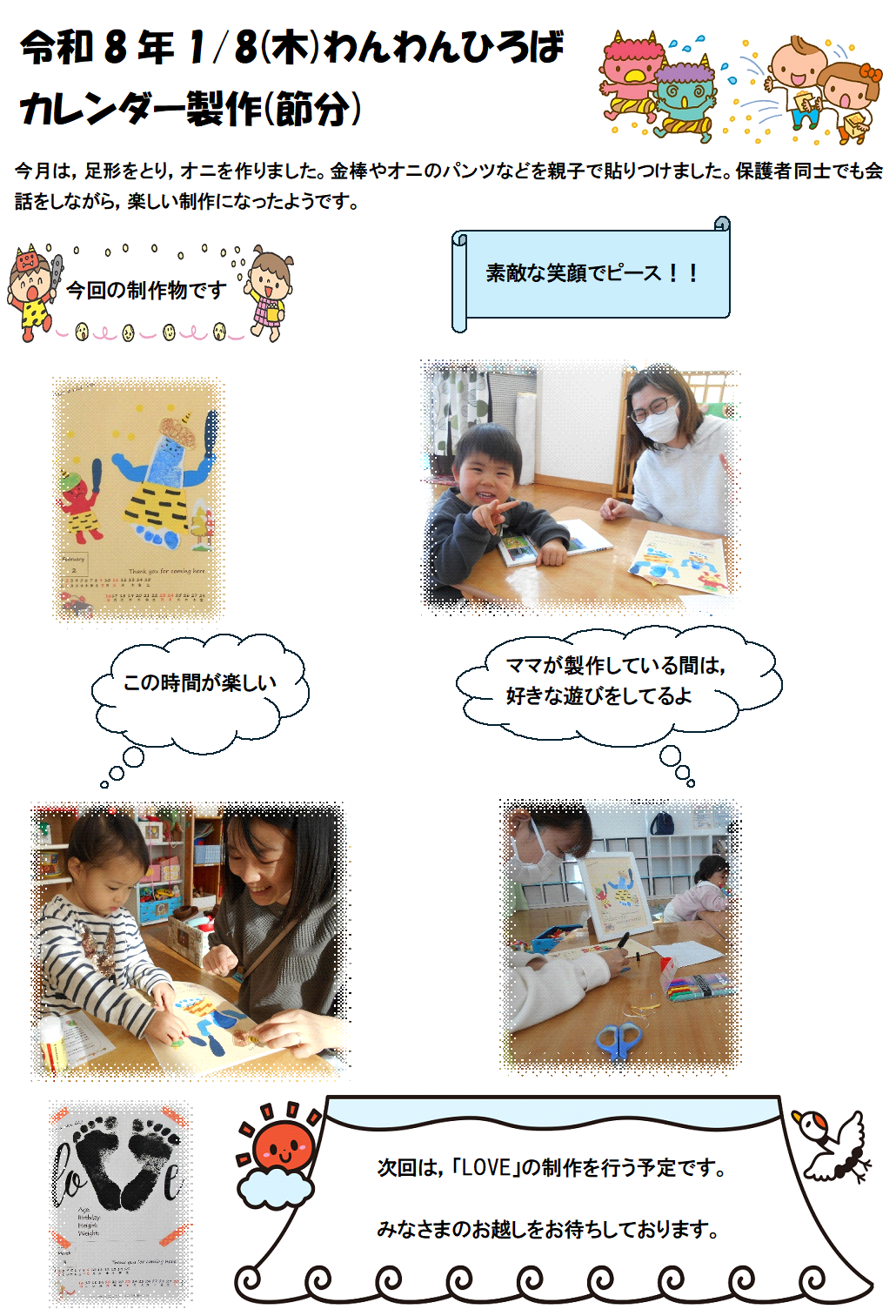 | わんわん広場では、不定期でイベントも行っております。親子で楽しめるイベントを用意していますので,たくさんの皆さまのご参加をお待ちしています。詳細などは随時お知らせしていきますので,のびのび子育て帳をご覧ください。 | ||||||||||