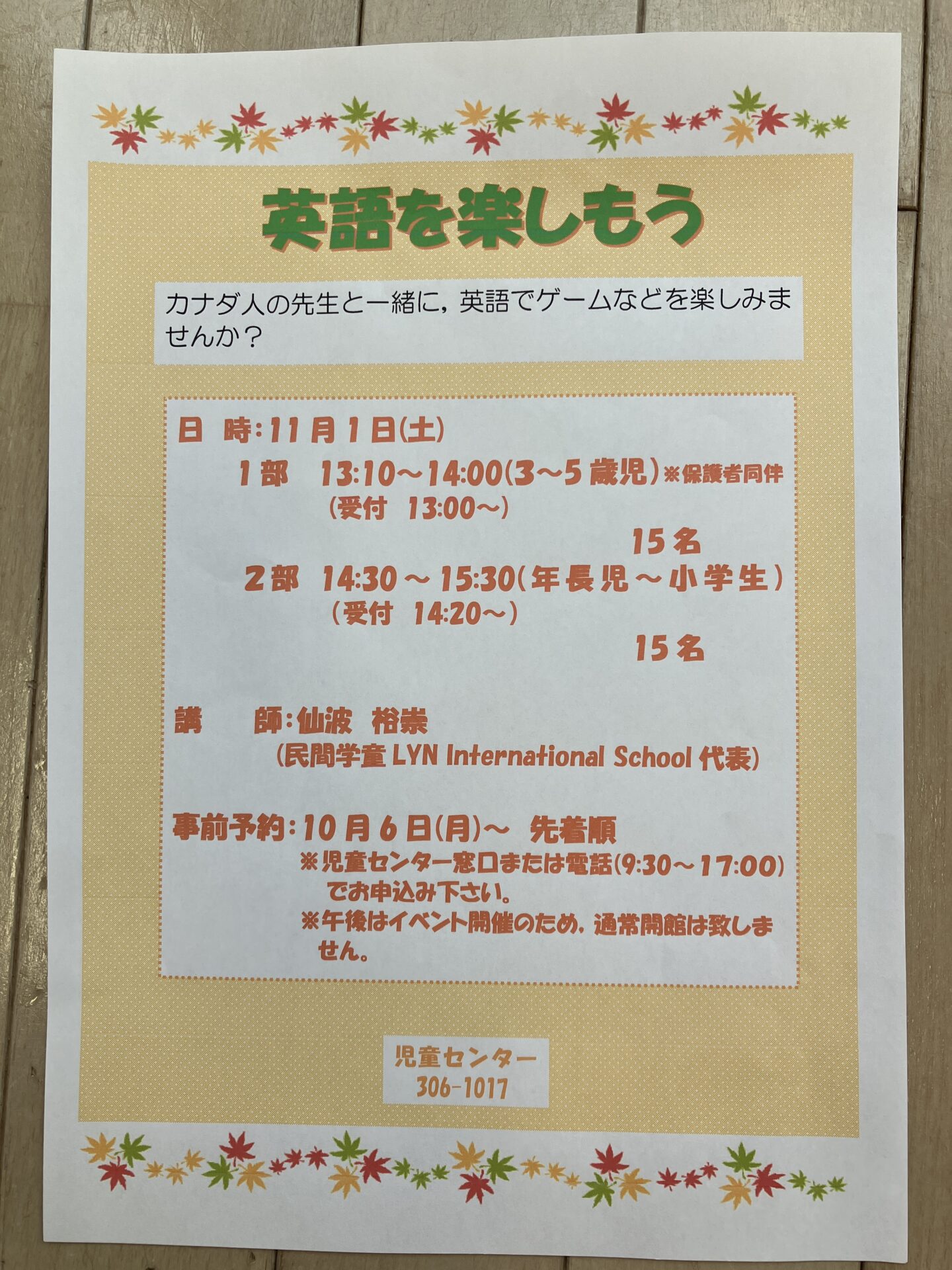 児童センターでは11月1日(土)に「英語を楽しもう」を開催します。
