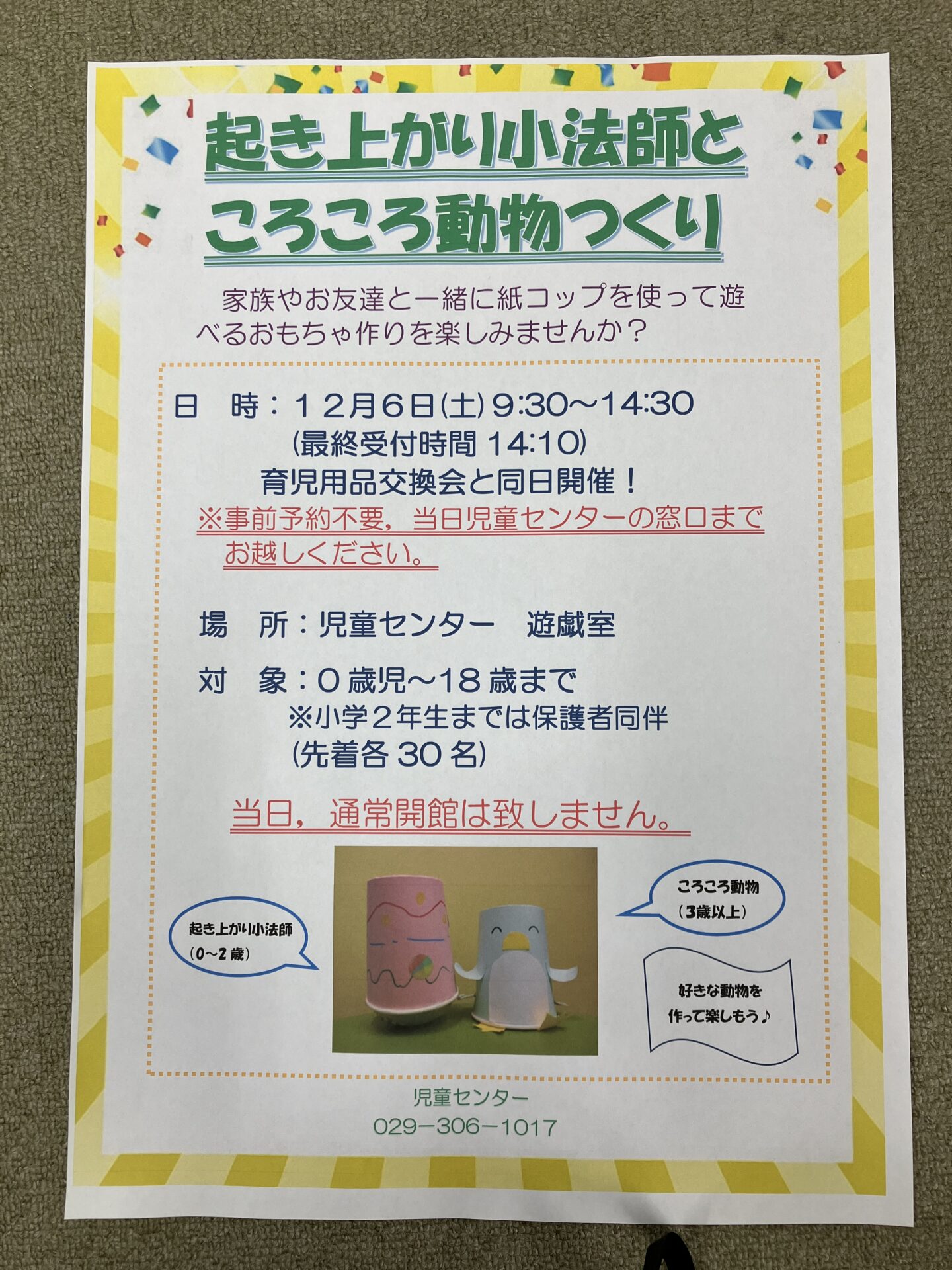 児童センターでは12月6日(土)に「起き上がりこぼしところころ動物作り」を開催します。