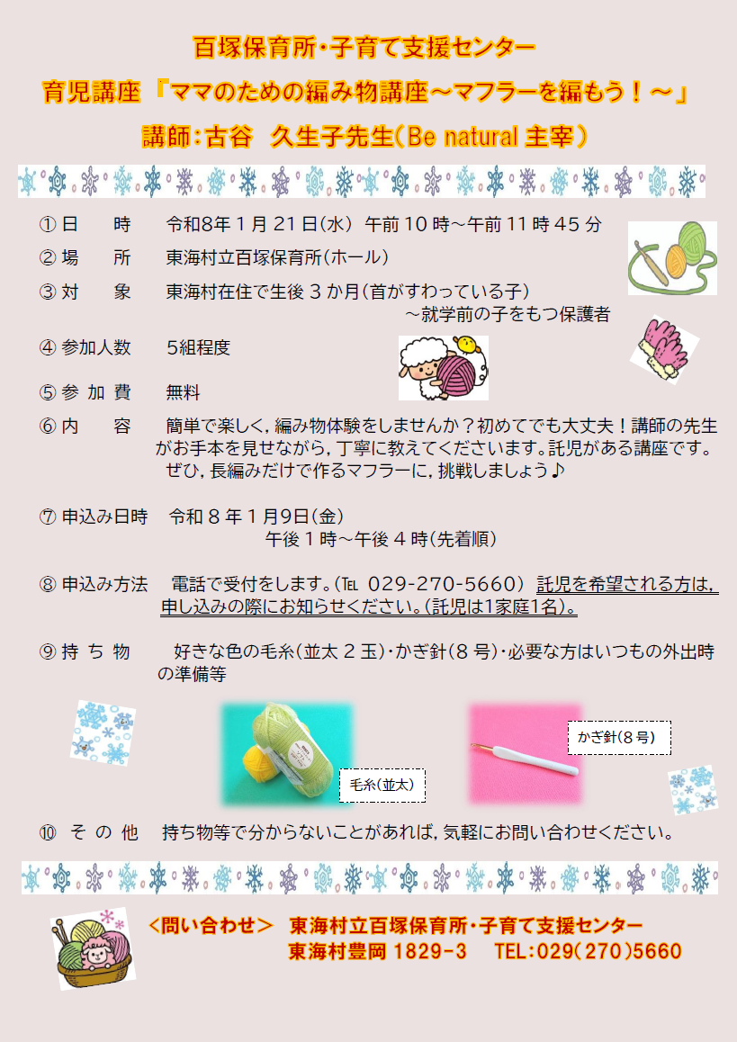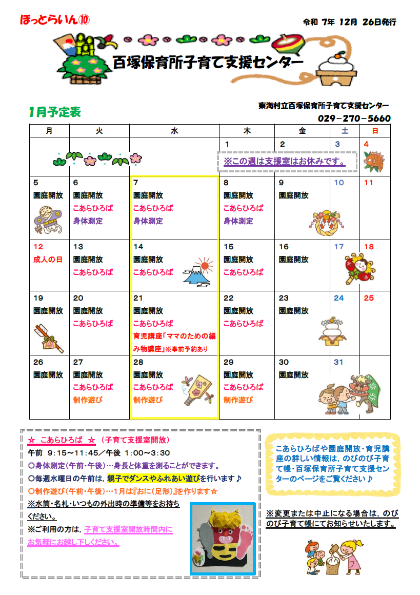 百塚保育所・子育て支援センター「1月のお知らせ」百塚保育所子育て支援センターから「1月の予定表」「1月の育児講座」についてお知らせします。興味のある方はぜひ遊びにいらしてください♪ (1)「ほっとらいん⑩」1月の予定表)」はこちら。 (2)「1月の育児講座」はこちら。