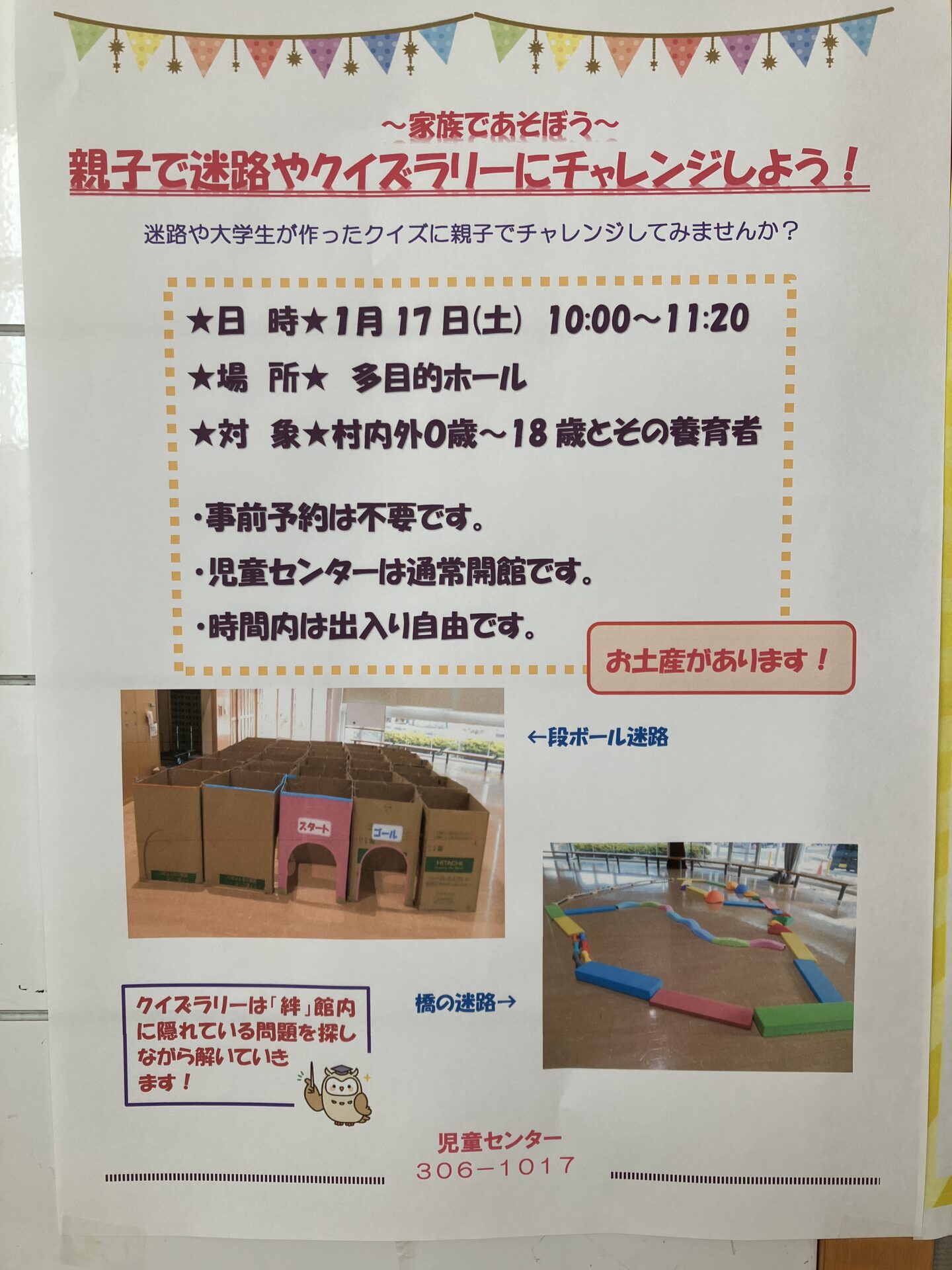 児童センターでは,1月17日(土)に家族であそぼう「親子で迷路やクイズラリーにチャレンジしよう」を開催します。