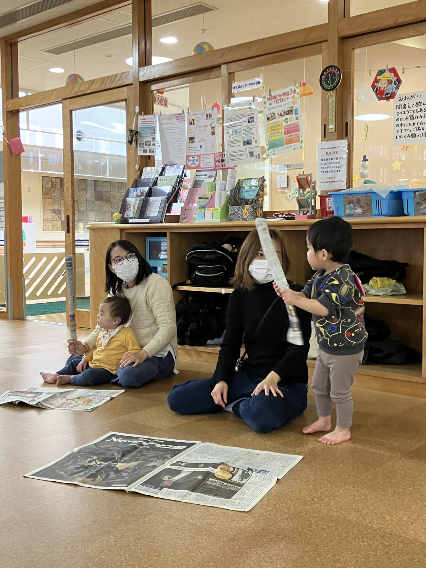 新聞紙を使って,色々な遊びを行います。新聞紙でマントを作ったり,びりびりしたり。汚れてもいい服装で来館してください。