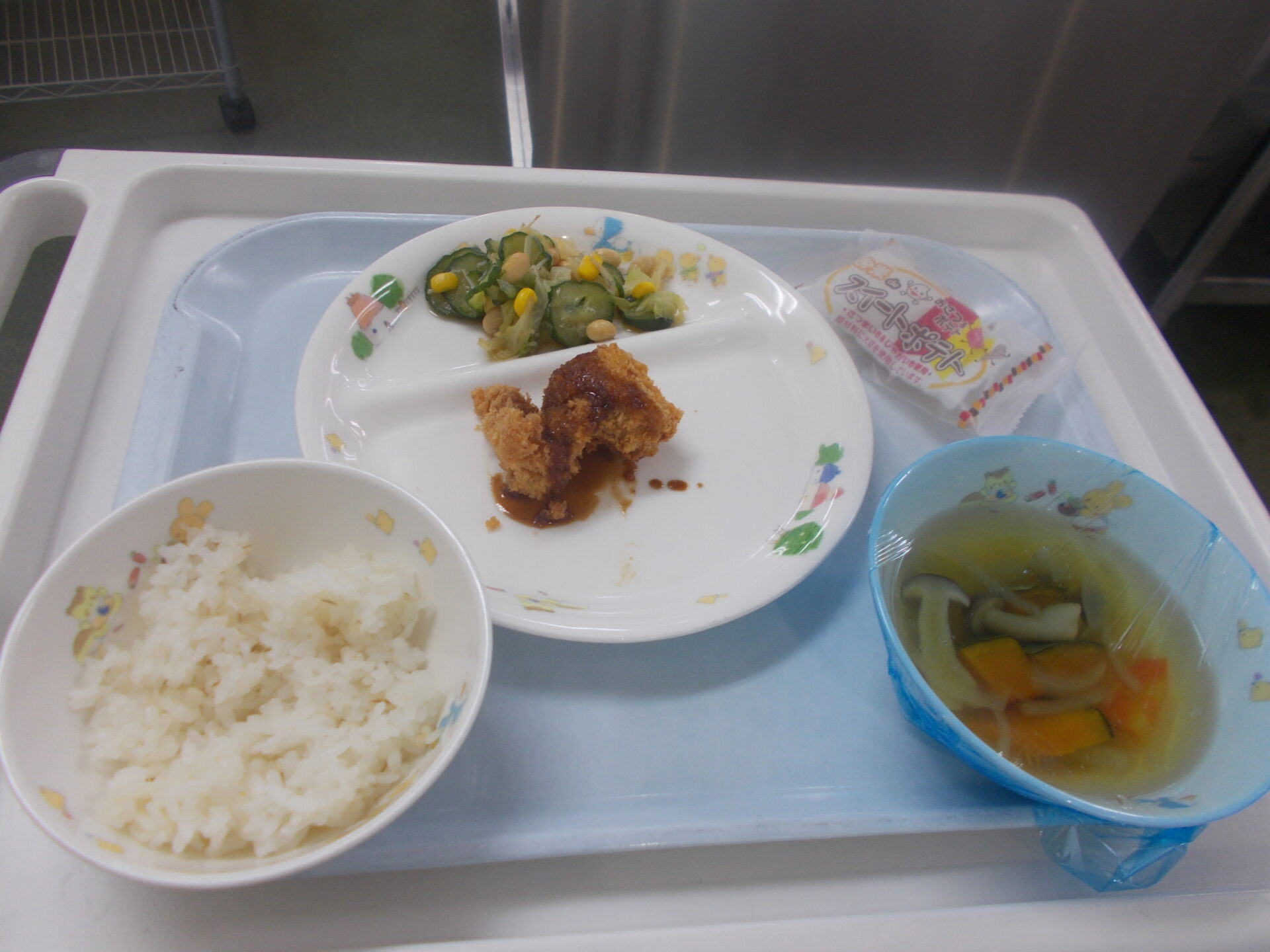 麦ごはん チキンカツ じゃこ豆サラダ かぼちゃのスープ スイートポテト