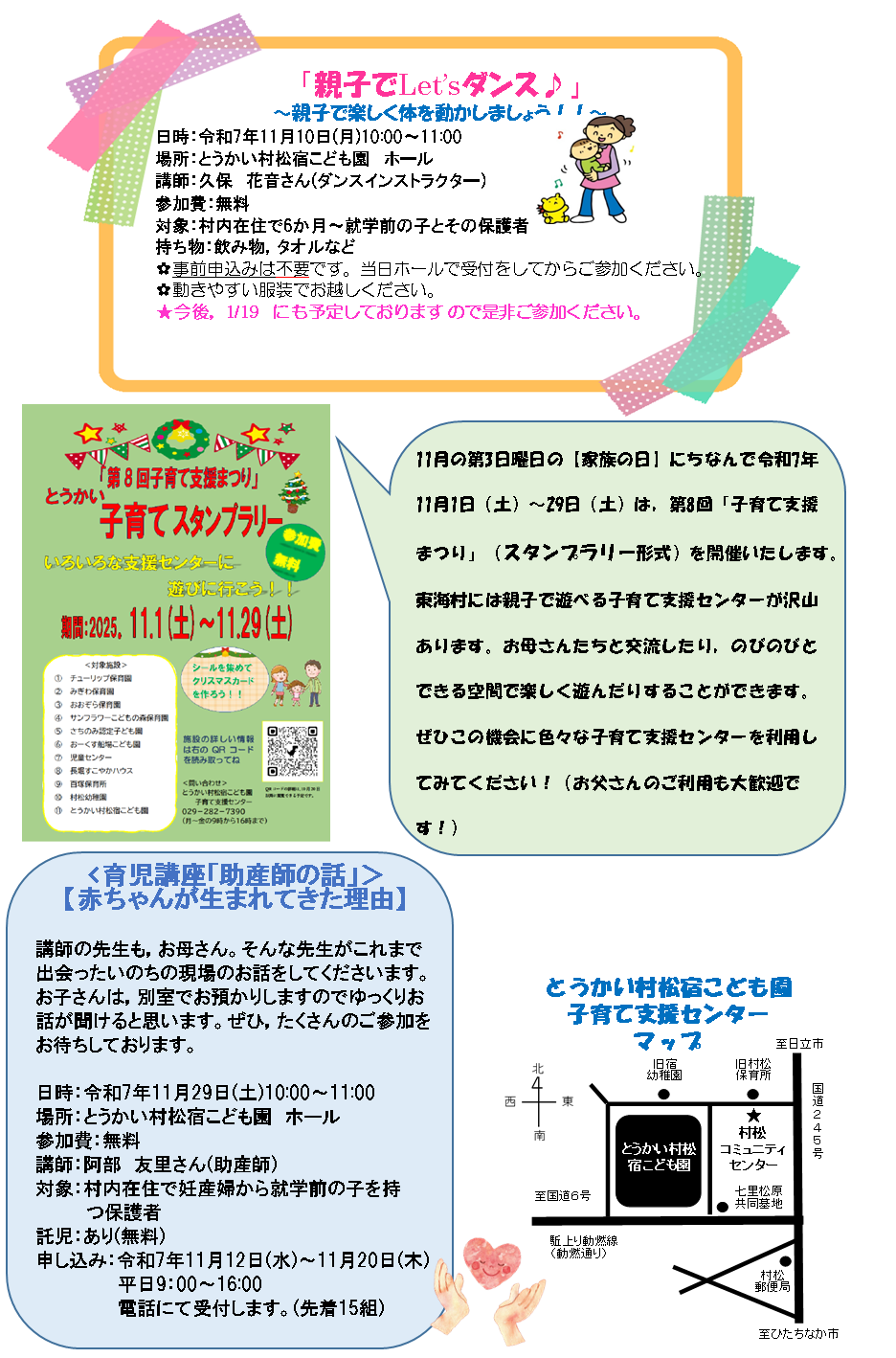 申し込み▼10/21(木)~定員になり次第終了となります。午前9時から午後4時に,とうかい村松宿こども園子育て支援センター(電話282-7390)へ電話で申し込みください。 |