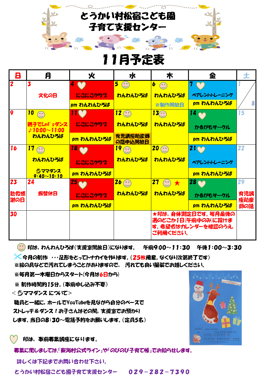 11月の予定表ができました。1日からは,第7回子育て支援まつりが始まります!!今年も,村内の子育て支援センターを回る,スタンプラリー形式です。親子で素敵なクリスマスカードを完成させませんか? |