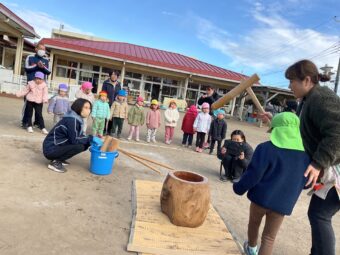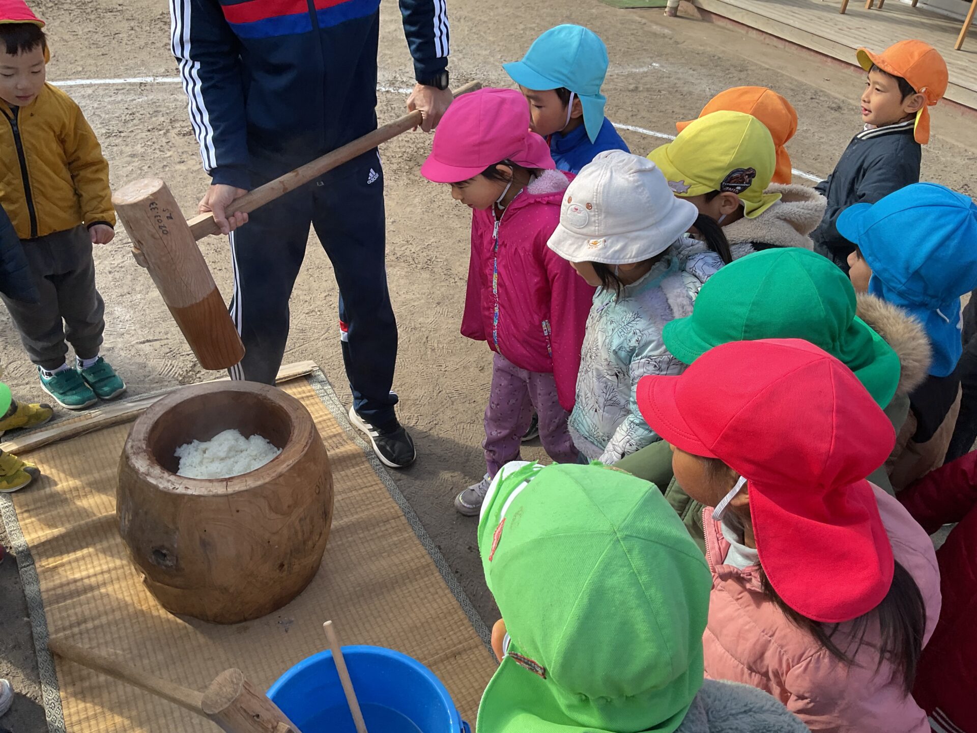 | 今日は餅つき会がありました。前日に年長児がもち米研ぎを行い今日に備えました。もち米はふかし窯で焚き上げ,臼杵を用いてお餅にしていきました。スタートは先生たちでこねていき,最後のつき上げは年中児・年長児が行いました。つきあがったお餅は,鏡餅にして保育所に飾りました。 | |||