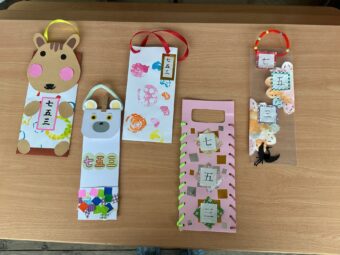 子どもたちが作った千歳飴袋 左から,りす組,うさぎ組,きりん組,ぞう組,らいおん組 |