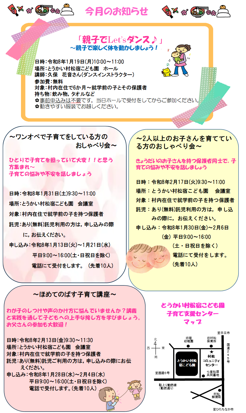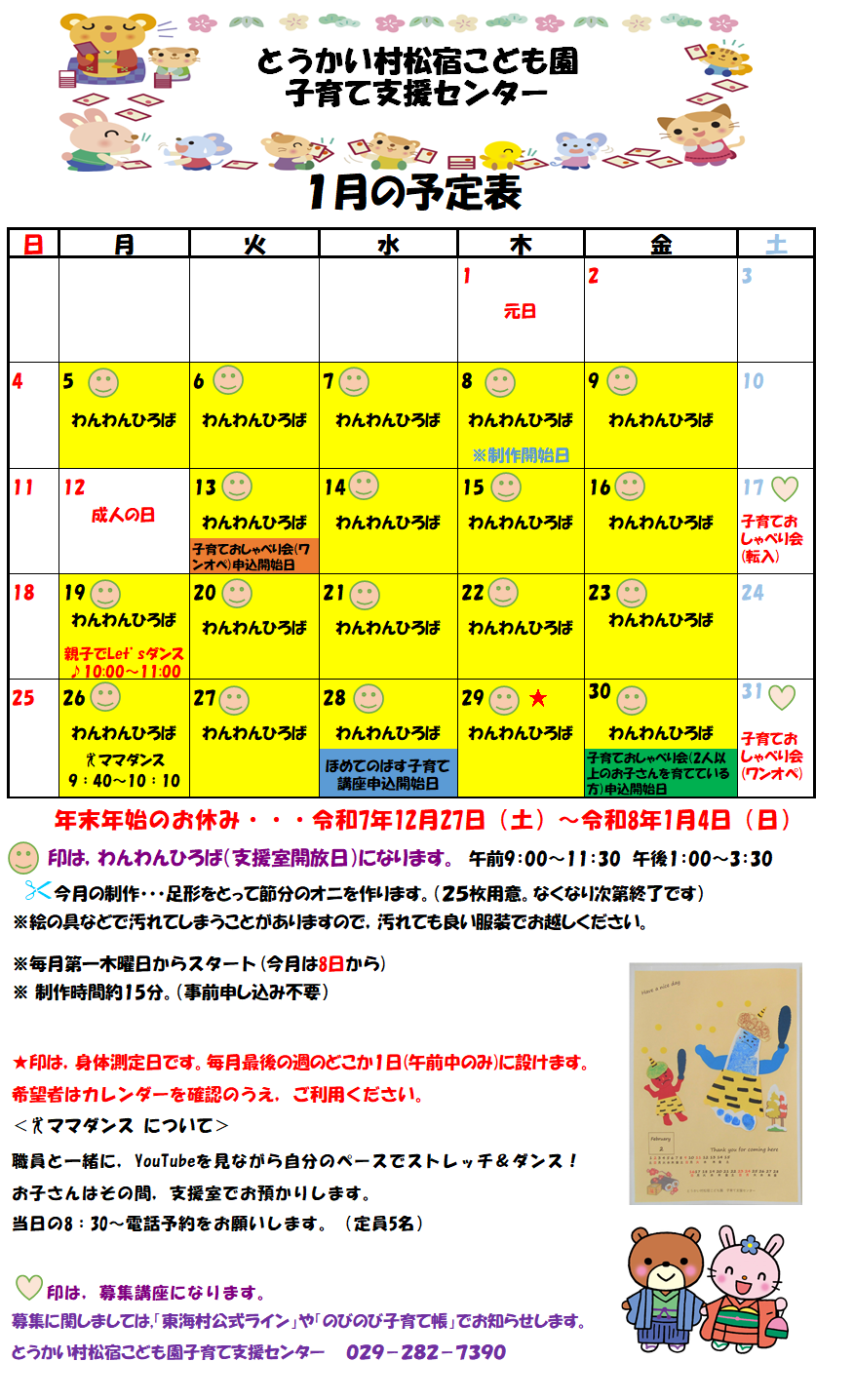 さて,今年も残すところあと2週間。今年は皆さまにとってどのような年でしたでしょうか? 「1月の予定表」ができました。2月と3月に予定しているイベント等についての情報を掲載してありますので、是非ご覧くださいませ。さらに詳しいことは,後日「広報とうかい」や「のびのび子育て帳」にてお知らせいたします。 今年もとうかい村松宿こども園子育て支援センターをご利用いただき,ありがとうございました。来年もどうぞよろしくお願いいたします! |