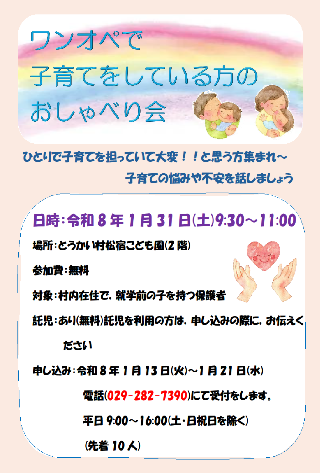 こんにちは!ワンオペで子育てをしている方のおしゃべり会のご案内です。子育ての悩みや不安を一緒に話しましょう。無料の託児つきで,保護者の方は別室でゆっくりと話せます。皆様のお越しをお待ちしています。