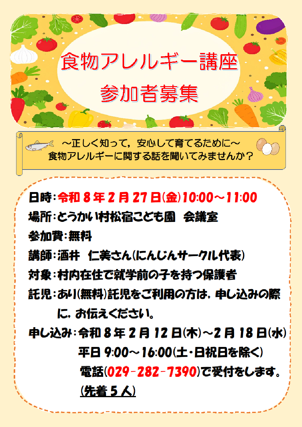 日時:9/19(金)・2/27(金) 10:00~11:00 場所:とうかい村松宿こども園 会議室 参加費:無料 講師:酒井 仁美さん(にんじんサークル代表) 対象:村内在住で就学前の子を持つ保護者 託児:あり |