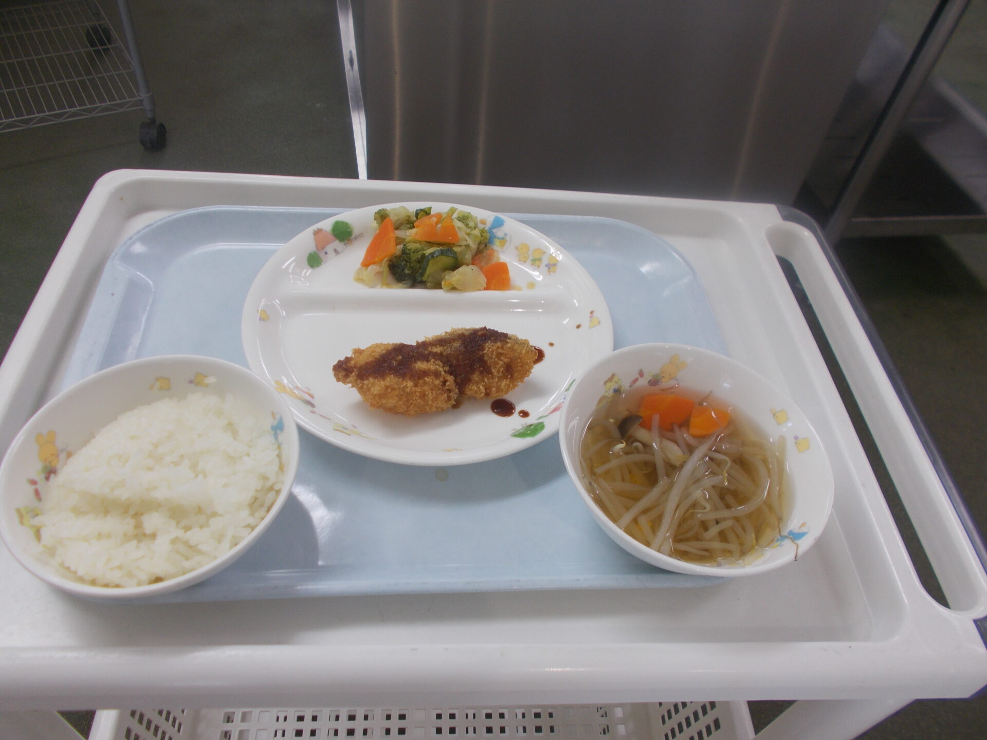 ごはん 白身魚のフライ グリーンサラダ もやしのスープ |