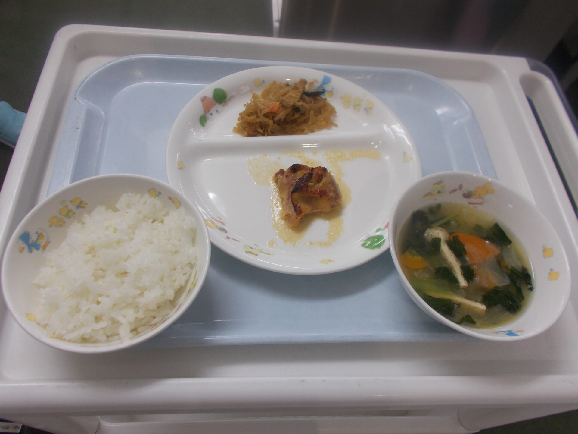 麦ごはん 鶏肉の照り焼き 小松菜ともやしのあえ物 白菜のみそ汁