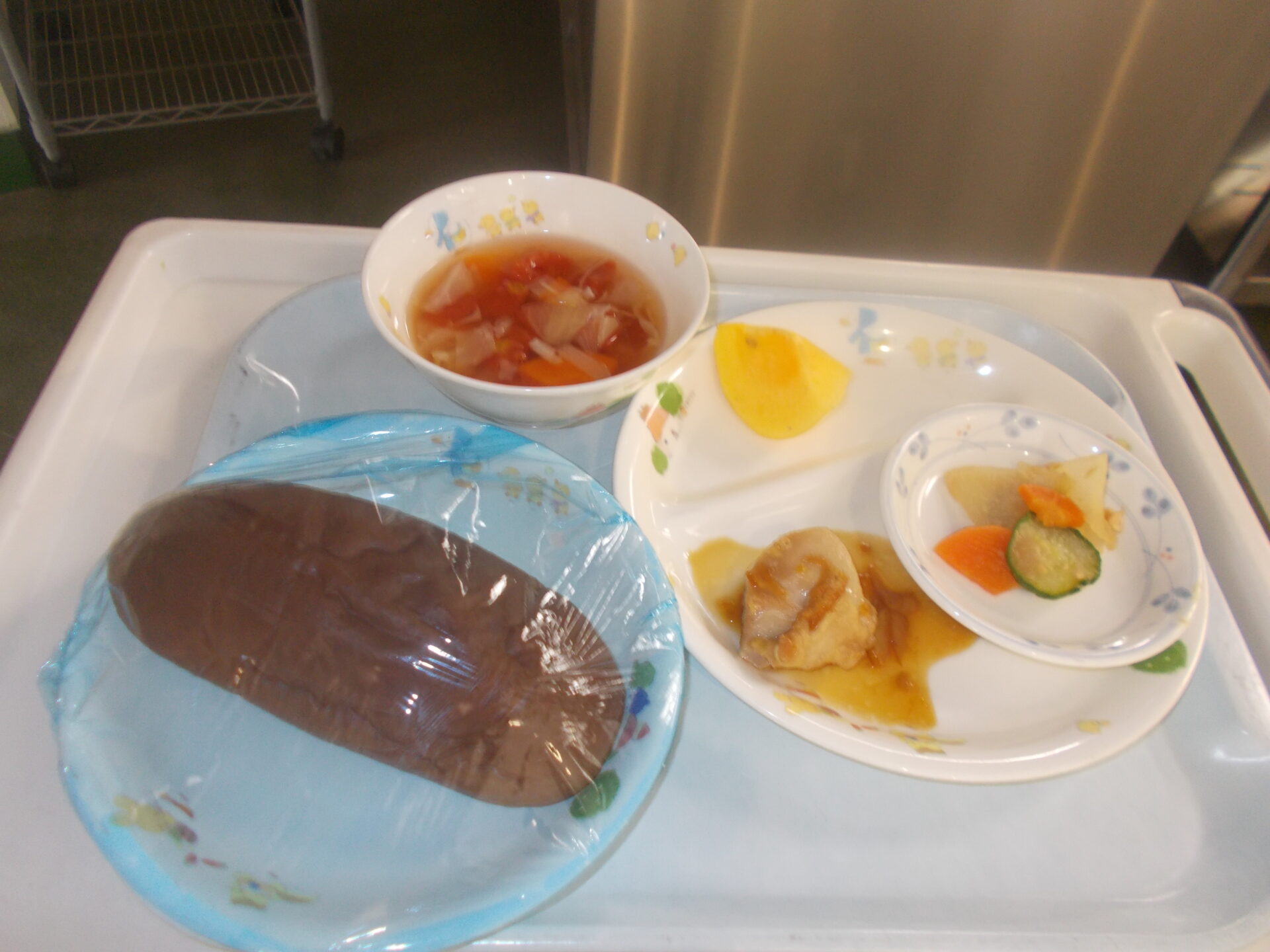 コッペパン 鶏肉のトマト煮 花野菜のサラダ かぼちゃのスープ 柿 |
