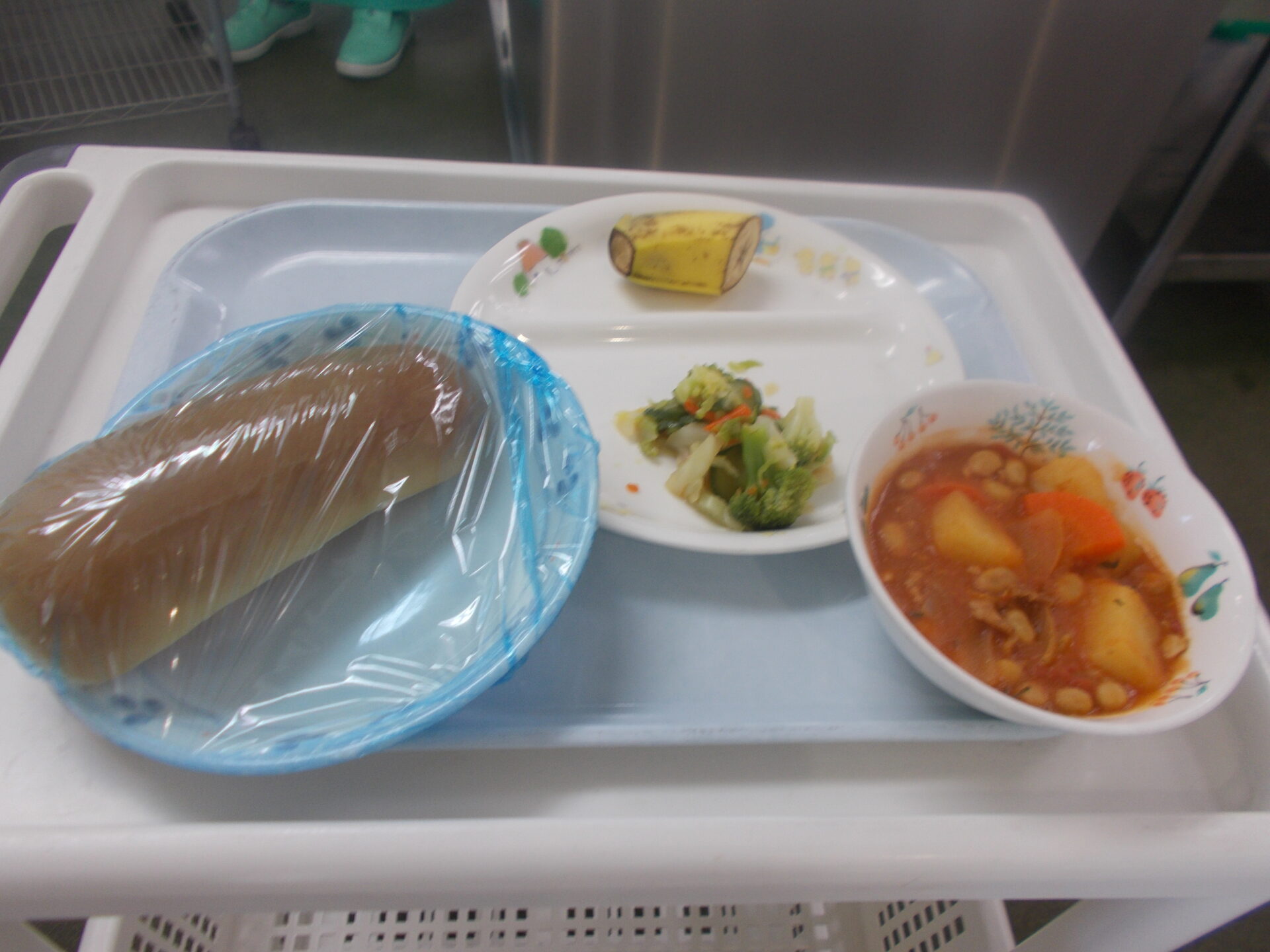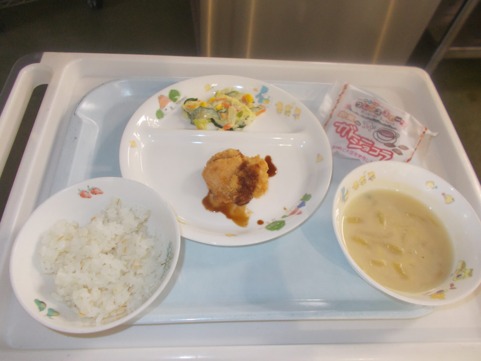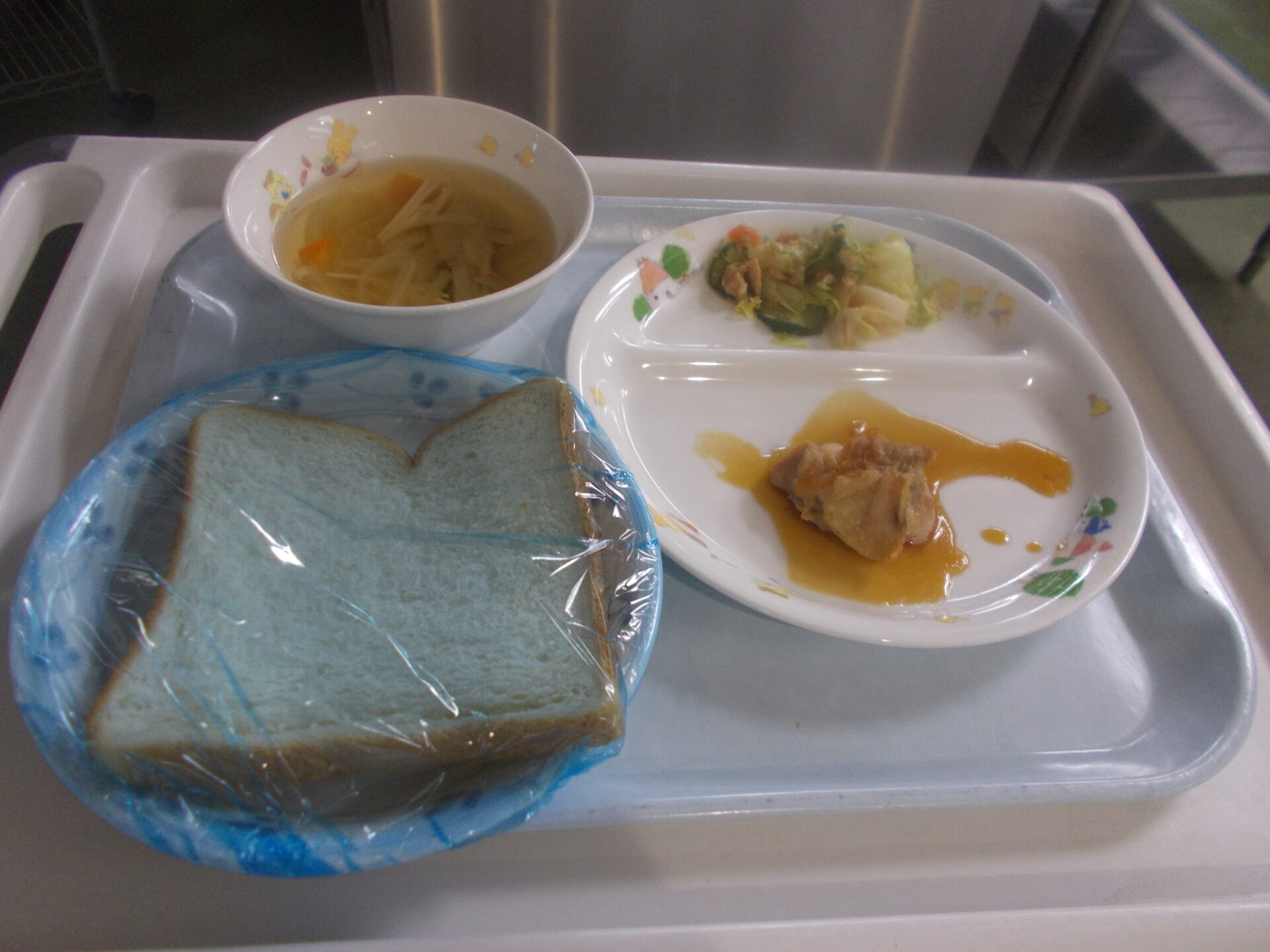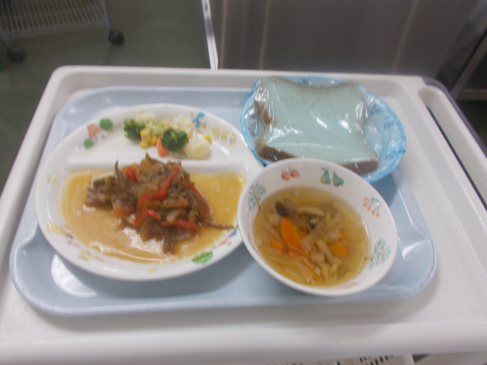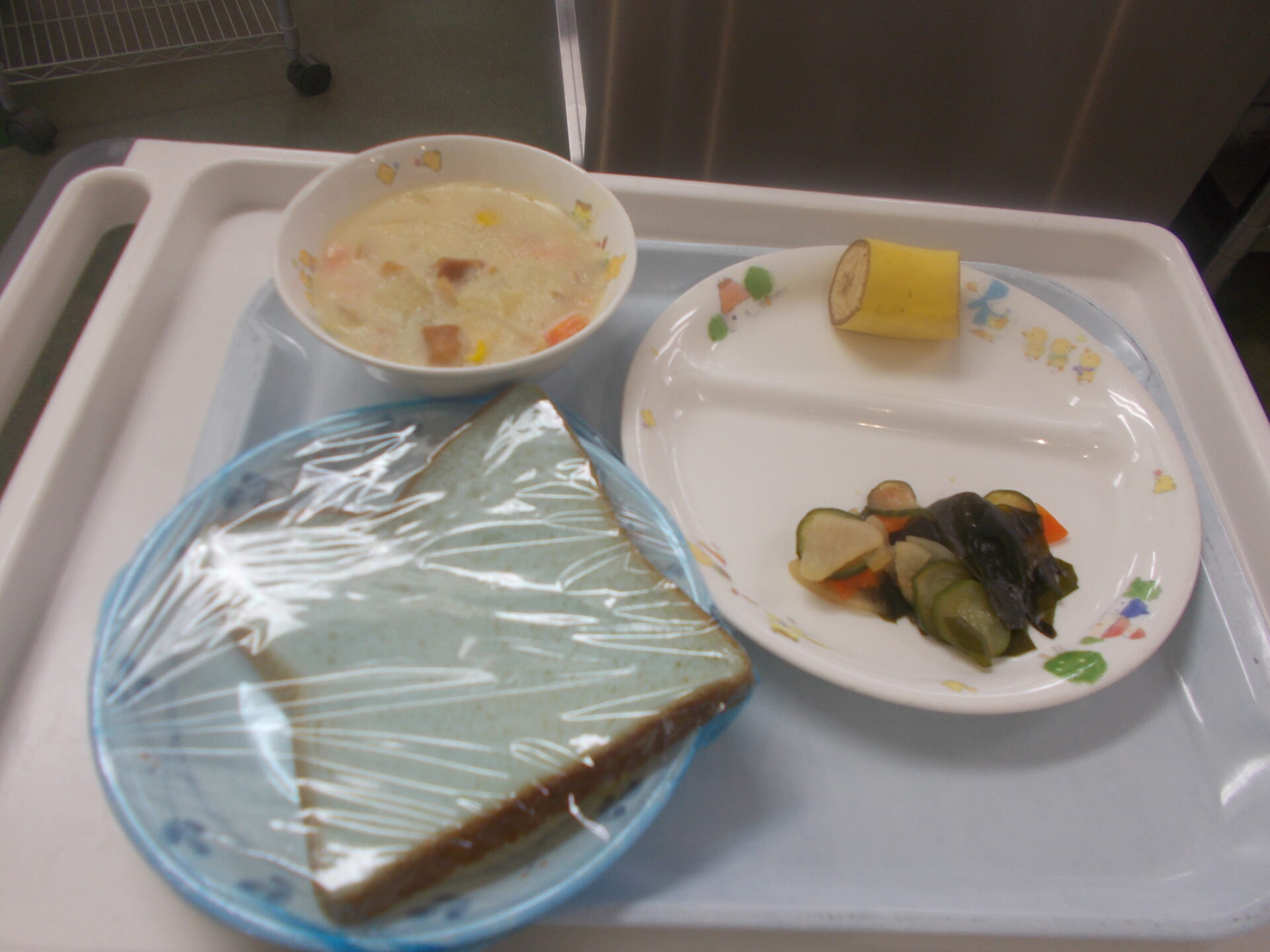 食パン ポークソテー 花野菜のサラダ キャベツのスープ