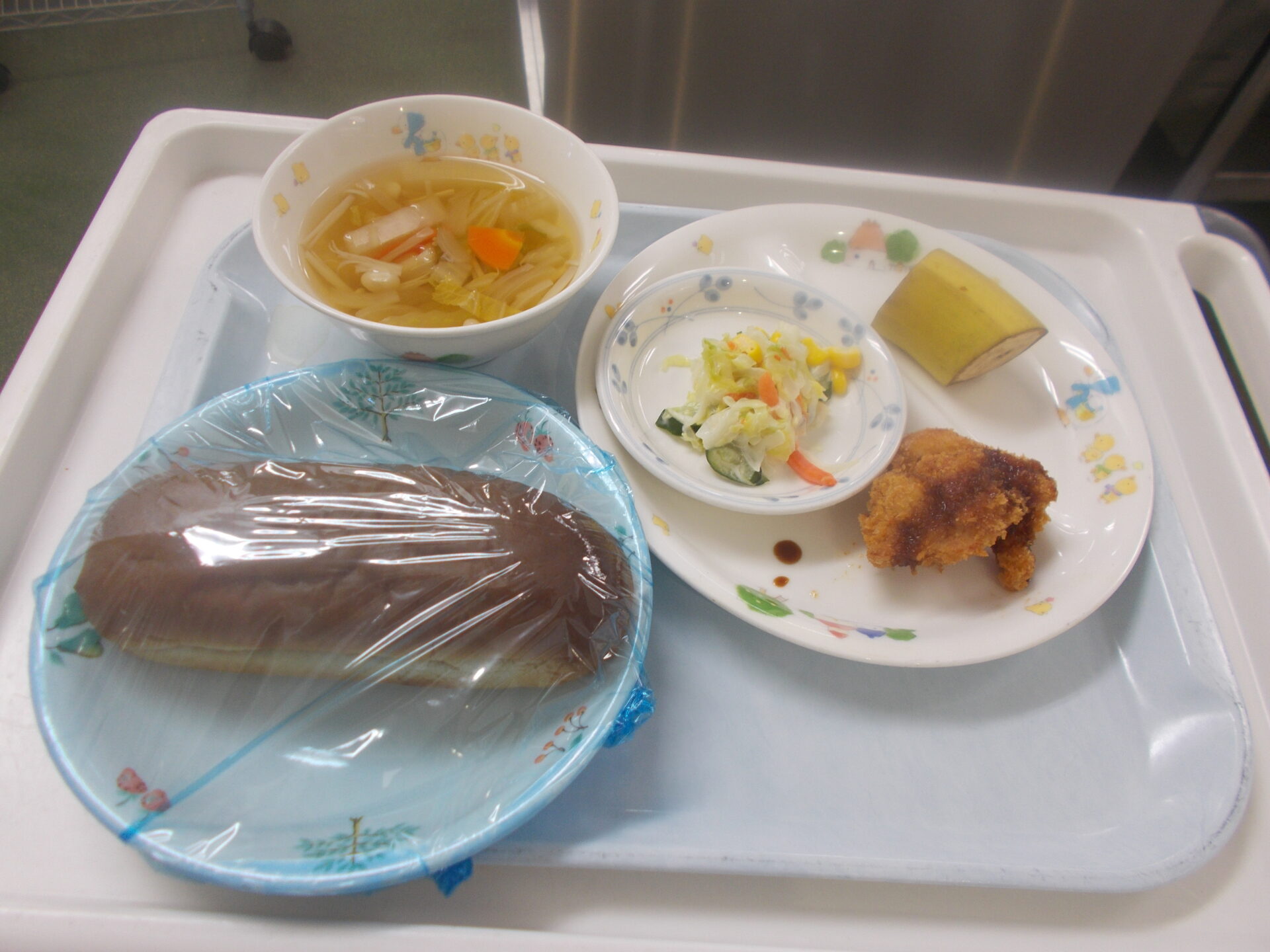 黒パン チキンカツ コールスローサラダ 白菜のスープ バナナ |