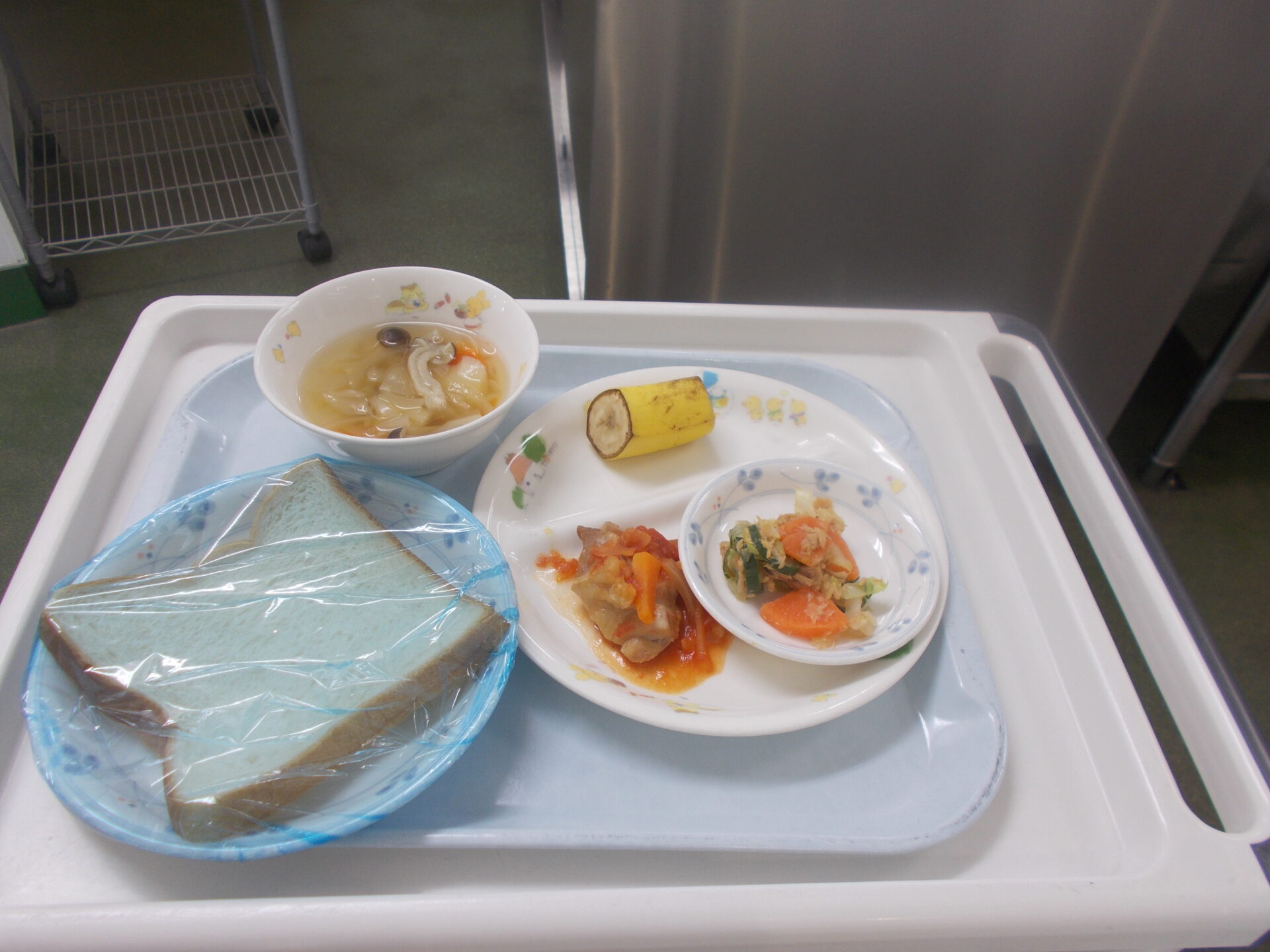 食パン 鶏肉のトマト煮 ツナサラダ じゃがいものスープ バナナ |