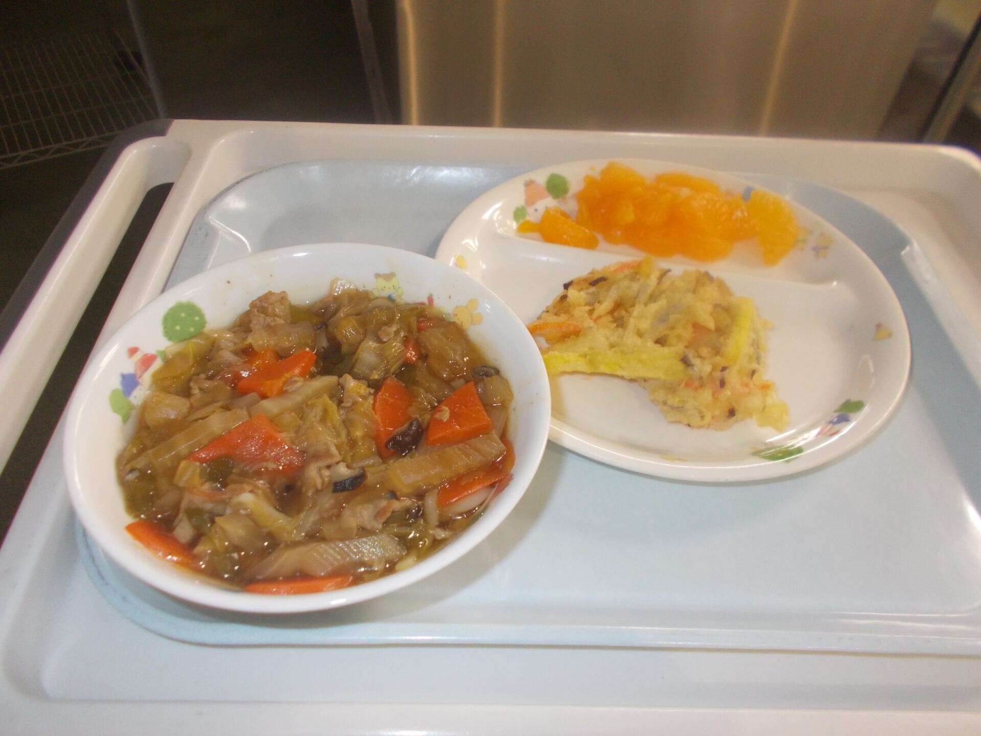 あんかけうどん 野菜のかき揚げ みかん缶 |