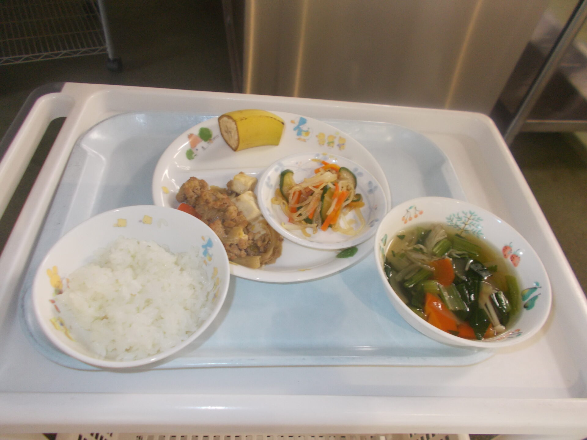 ごはん 麻婆豆腐 春雨サラダ 小松菜のスープ バナナ |