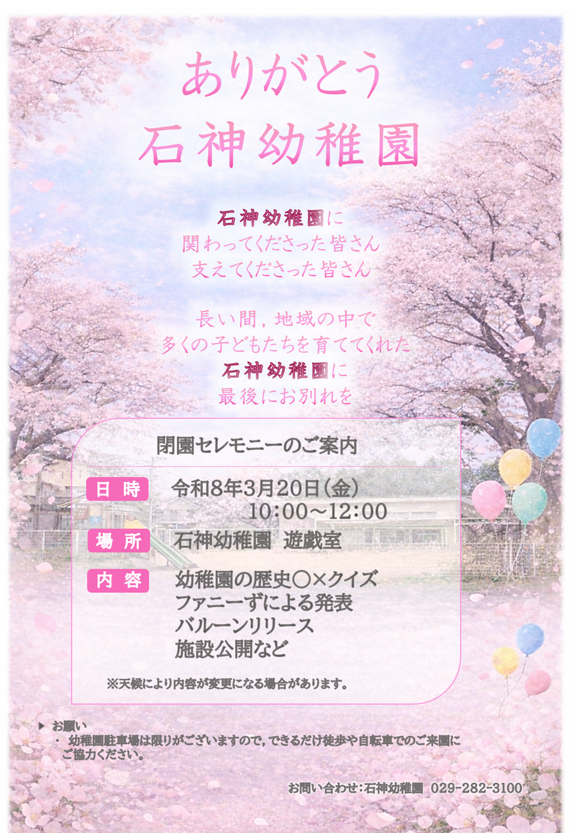★令和8年3月31日(火)を持ちまして石神幼稚園は閉園いたします。 令和8年3月20日(金)に閉園セレモニーを行います。石神幼稚園に思い出のある方は是非,閉園セレモニーにお越しください。 遠方に行かれている方がいらっしゃいましたらお誘いいただけると嬉しいです。 |