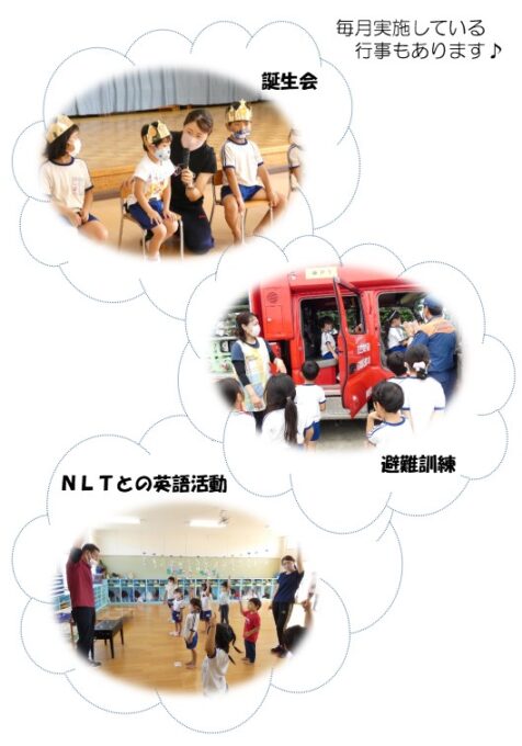 年長→年中→年少の順番で子どもたちと一緒に遊んだり,読み聞かせをしていただいたり,歌を歌ったり,お弁当を一緒に食べたりします。NLTの先生と関わることで,英語に親しみ,外国の方と自然にコミュニケーションが図れるようにしていきます。